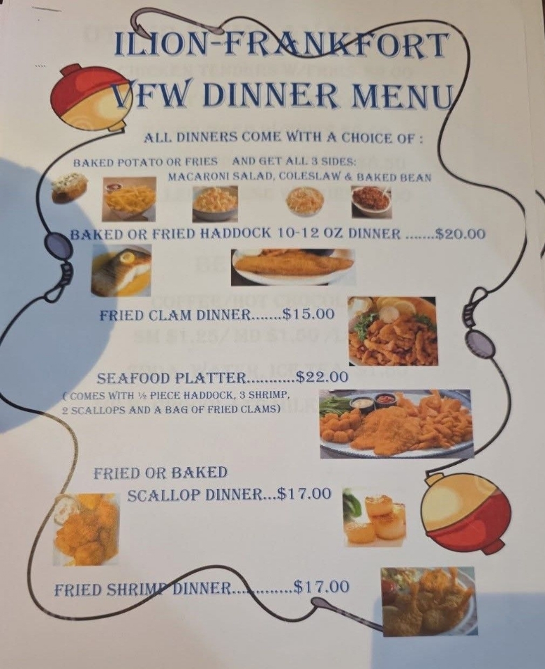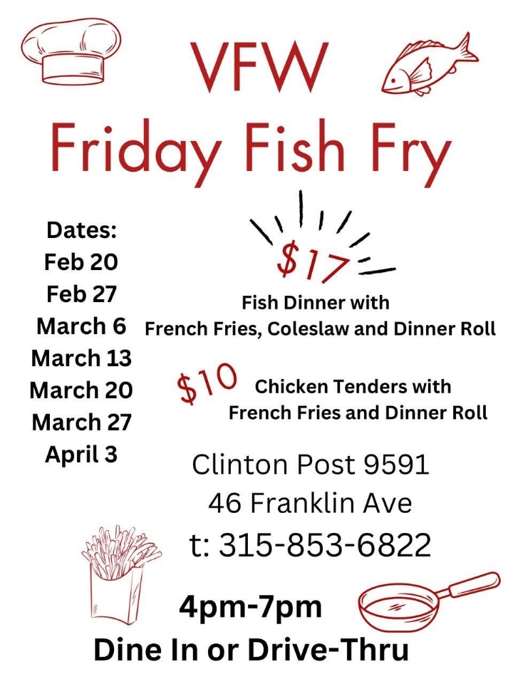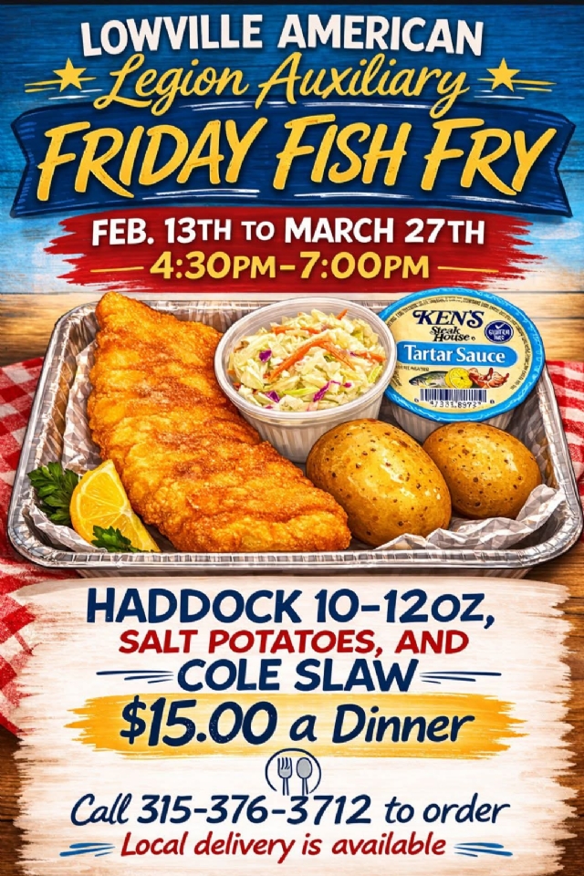 - Fish Frys: Clinton Aux 9591, Ilion Aux 502, Lowville Aux 6912